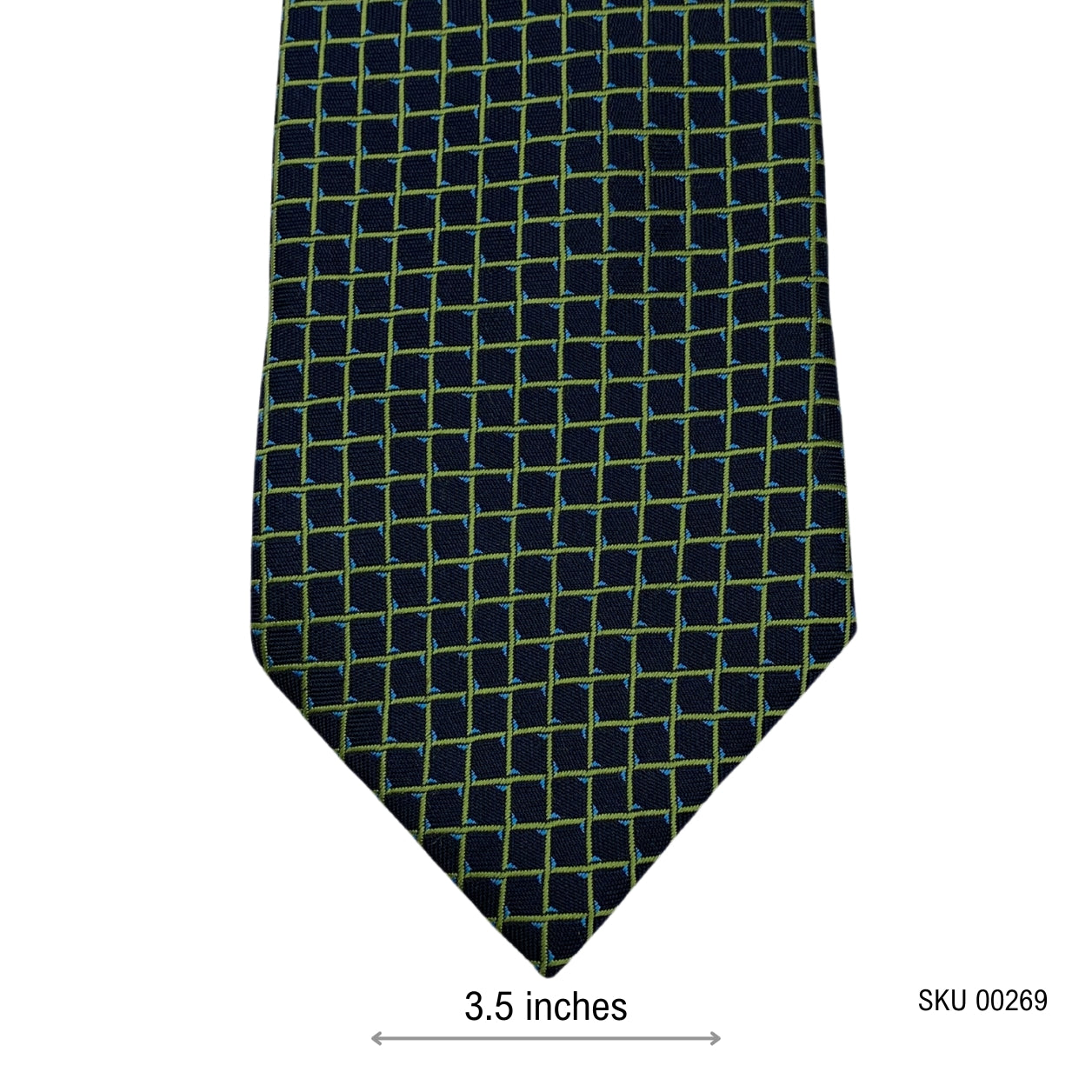 This sophisticated men's tie features a modern geometric grid pattern with intersecting lines in shades of lime green and light blue on a dark navy background. The subtle texture of the fabric gives it a professional and polished look, making it a great choice for business meetings, formal events, and everyday office wear.